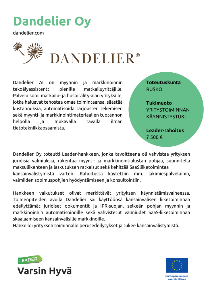Dandelier Oy toteutti kesällä–syksyllä 2025 Leader-hankkeen, jonka tavoitteena oli vahvistaa yrityksen juridisia valmiuksia, rakentaa myynti- ja markkinointialustan pohjaa, suunnitella maksuliikenteen ja laskutuksen ratkaisut sekä kehittää SaaS-liiketoimintaa kansainvälistymistä varten.